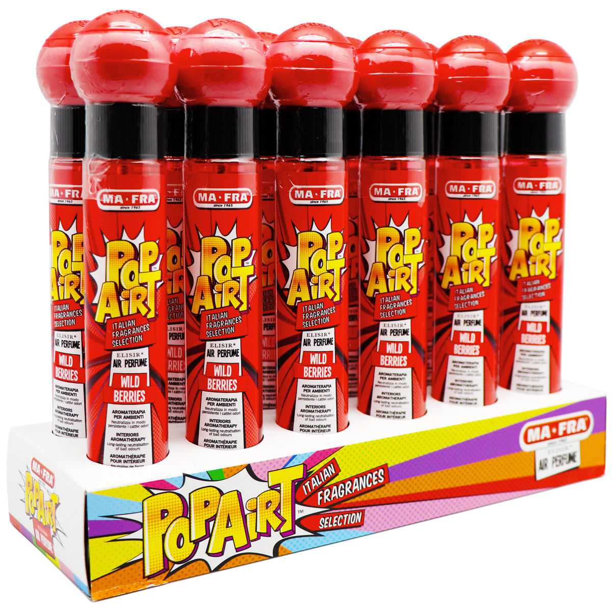 MAFRA Pop Art Auto parfum in de geur Wild Berries. Een geur die je geroken moet hebben! Transformeer je auto tot een heerlijk fruitige, schoon en lekker ruikende auto. Ontdek wat jouw favoriete geur is!