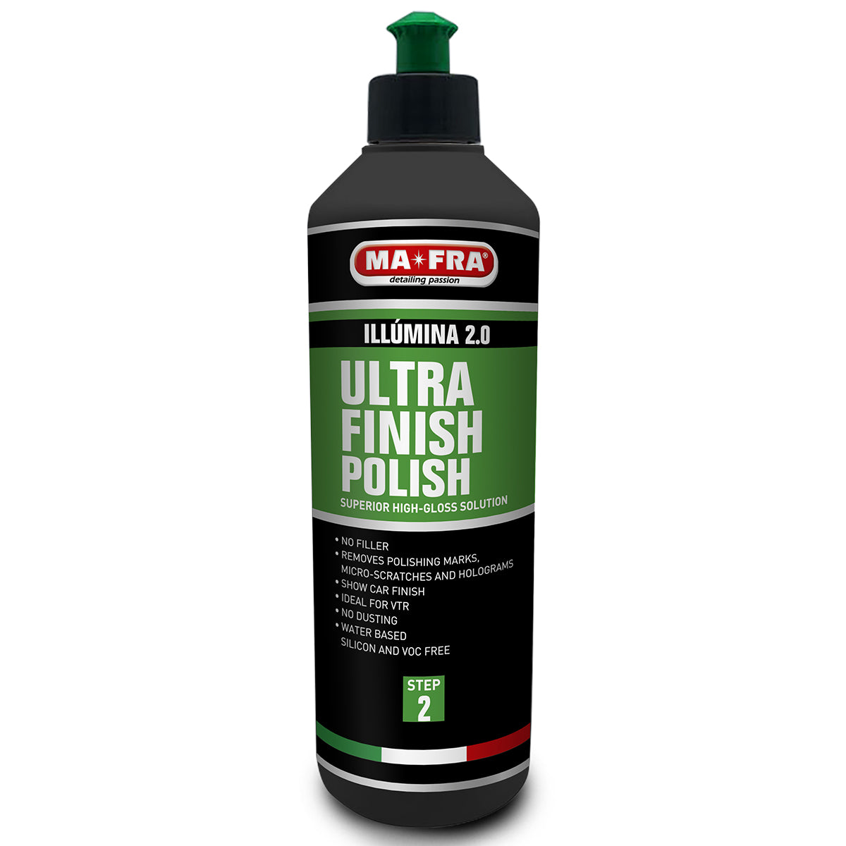 Het middel verwijdert lichte swirls en krasjes en zorgt voor een geweldige glanzende finish. Mafra Illumina is een product op waterbasis en bevat geen siliconen en fillers.