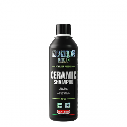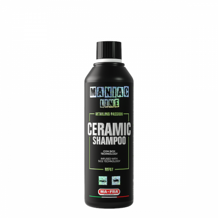 Ceramic Shampoo van Maniac Line is een 3-in-1 formule product met Si02 keramische polymeren dat wast, verzegelt en beschermt voor 90 dagen in een enkele handeling. Ceramic Shampoo is ook ideaal voor onderhoudswerkzaamheden en verhoogt en verbetert de eigenschappen van de wax, de sealant en de keramische coating die eerder op het oppervlak zijn aangebracht. Het product geeft het behandelde oppervlak een ongeëvenaard zelfreinigend hydrofoob vermogen dat de auto lang schoon houdt en het oppervlak zijdezacht maakt, waardoor het een glans krijgt die te vergelijken is met een autowas in een potje. Veelzijdig product te gebruiken met een handschoen of pad om over het oppervlak te verdelen of door schuimtechniek.